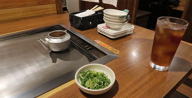 これを鉄板の端で温めて待ちます。ネギも登場します。