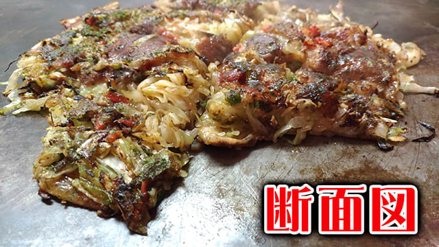 広島風お好み焼きと大阪のお好み焼きの中間みたいな感じでしょうか。