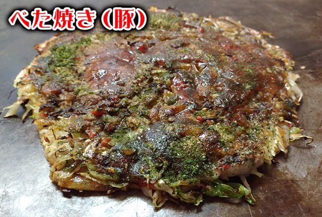 今回は、べた焼き(豚)と、焼きそば(イカ)を注文。